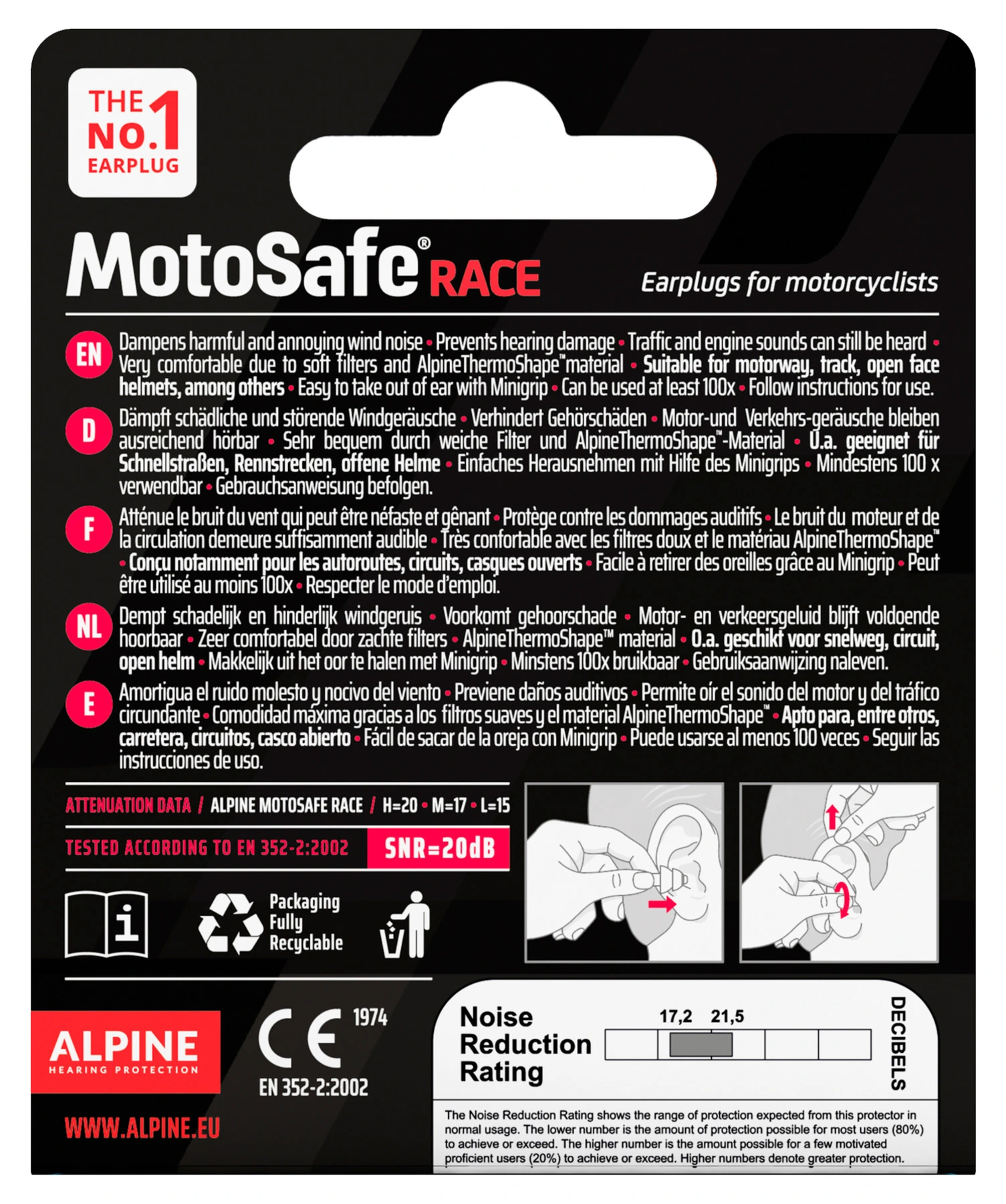 Giving full throttle on the motorway or race track, or as a spectator enjoying the action at the grand prix, your ears are subjected to quite a few decibels. In fact, the noise level can easily go above 80 dB. And under a helmet, even 106 dB is not unusual. To contend with this sort of noise, Alpine Earplugs offers the ideal protection – MotoSafe Race.